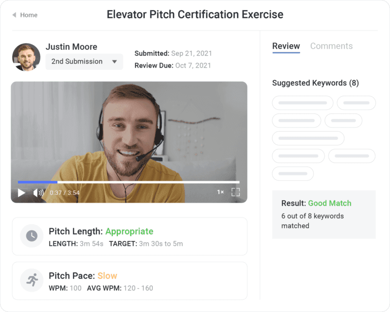 It provides instant feedback on both what you said and how you said it. It analyzes your performance on things like sentiment, pace of speech, and use of filler words, then gives you specific suggestions for improvement say around your introduction, discovery skills, and value selling.
