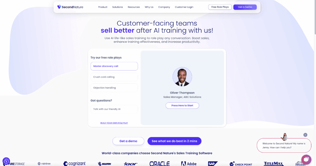 Second Nature is an AI Role Play platform that’s used by sales teams to practice and refine their pitch in a realistic, interactive environment. Second Nature acts as a “virtual pitch partner,” engaging with sales reps and providing feedback so they can improve on their own.