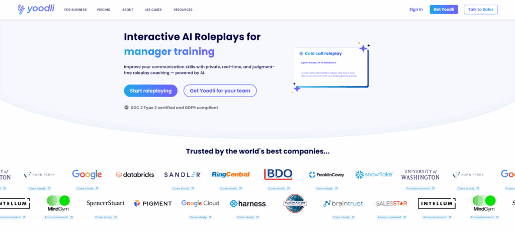 Yoodli is an AI Role Play platform that helps people communicate with more confidence. Yoodli isn’t designed exclusively for sales. However, a growing number of sellers use this AI Role Play software to practice their skills and get private, real-time feedback to improve their communication skills.