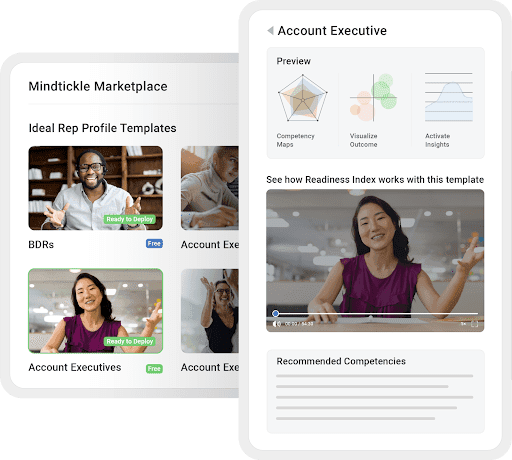 Trying to change behavior is meaningless if you don’t have a target or goal. This is where the ideal rep profile and Mindtickle’s Readiness Index come in. Outline the set of competencies a rep needs in their position to start your journey to correlating engagement with enablement, training, and coaching with outcomes.