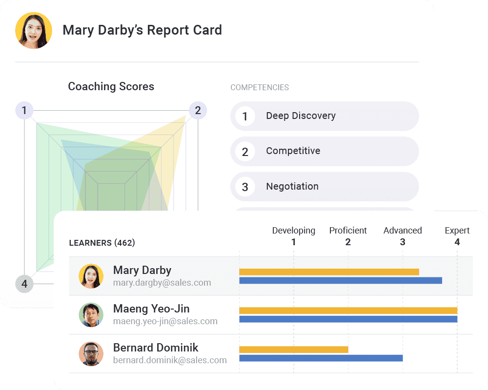 While deal coaching has its benefits for short-term needs, skill coaching delivers results that generate long-term revenue growth. Using data to inform one-on-one sessions, providing the right learning content at the right time, and ultimately cultivating the behaviors and knowledge of top-performing sellers, your team will achieve peak productivity and revenue growth.