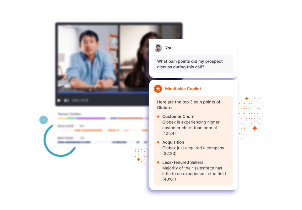 Look for ways to leverage AI like Mindtickle’s Copilot to effectively and efficiently analyze your sales calls. For example, AI can summarize call recordings and help you pinpoint key moments in a call. A sales rep can use AI to ask a question like, “Which competitors did my customer bring up on this call?” Then, the sales reps can use these insights to tailor their follow-up and combat objections.