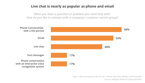 Customers are also getting used to talking to AI, with 48% of people favoring live chat compared to 54% preferring email. The gap is closing.