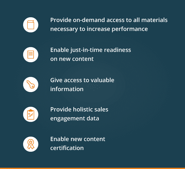 Provide holistic sales engagement data: In this data-driven world, teams involved in the creation of sales content and training collateral require a comprehensive view of their reps’ engagement with all sales-oriented materials. Best practice sales organizations leverage this data to pinpoint the strengths and weaknesses of their salespeople and further inform their enablement initiatives.