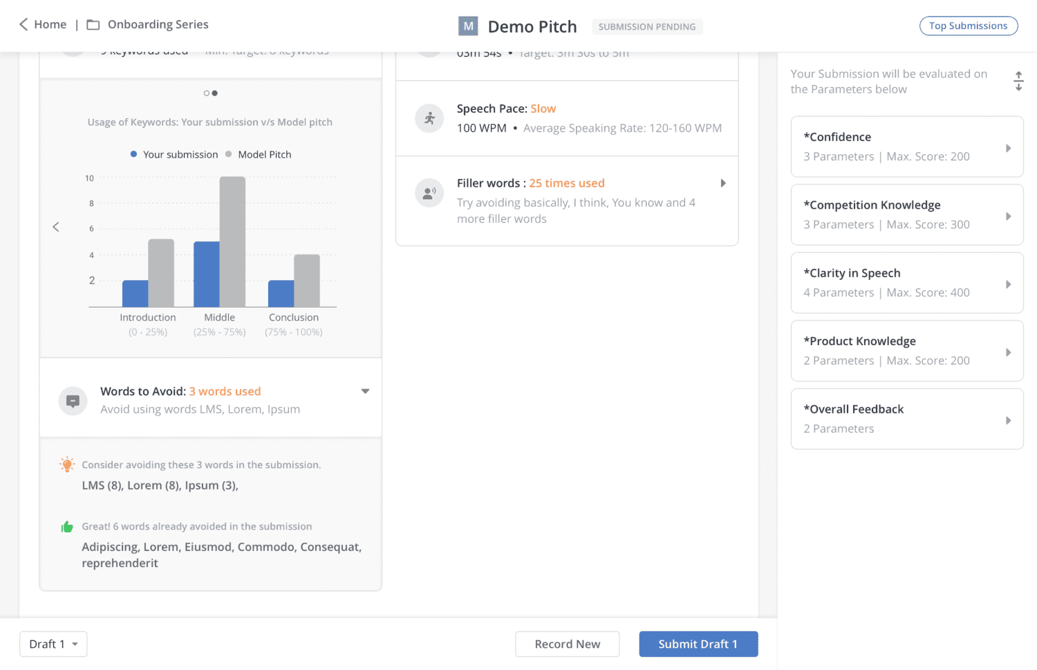 Sellers can learn what good looks like using Model Pitch before they practice. Every time they make a recording to practice, Mindtickle now delivers instant and meaningful feedback to them. It helps them find improvement areas. They can leverage the feedback and the model pitch to learn how to address the improvement areas and practice again. With feedback available at every practice, the seller is becoming consistent with the best in class pitch.