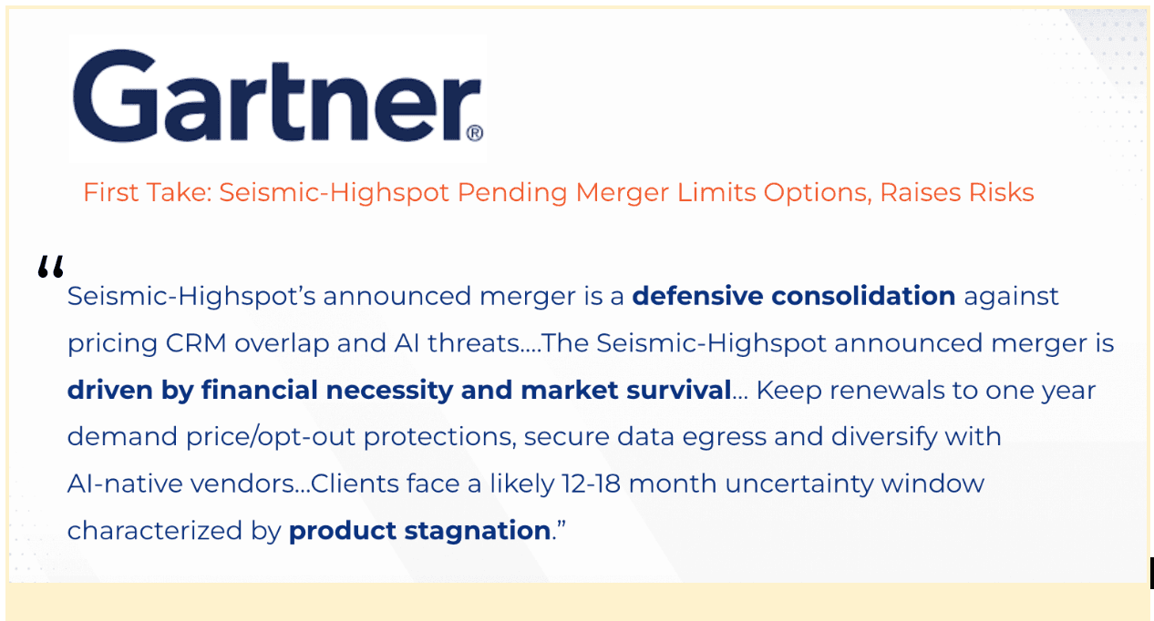 Today, revenue teams face immense pressure to improve efficiency and productivity per head. The Highspot-Seismic merger introduces product, pricing, and support uncertainty that agile revenue organizations just can't afford.