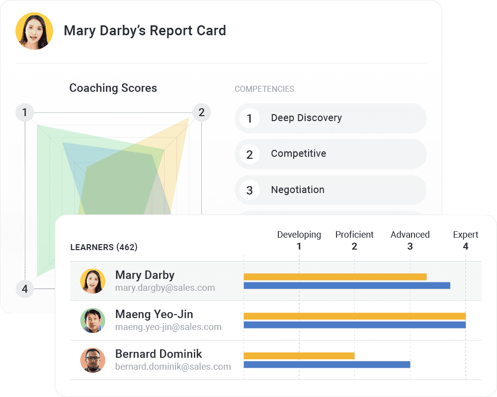 Use this information to focus on unique skills and behaviors individual reps are struggling with in one-on-one coaching sessions, and follow up with enablement content to reinforce what was learned.