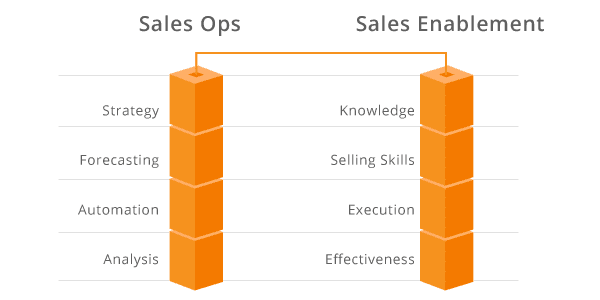 Sales Ops is typically involved in the front and back-end processes that create the strategic framework, forecasting, and analysis. They are also responsible for managing sales automation processes that often improve the efficiency of the sales organization. Sales Enablement’s role is focused on the reps and their capabilities. Building knowledge, sales skills, execution discipline, and effectiveness.