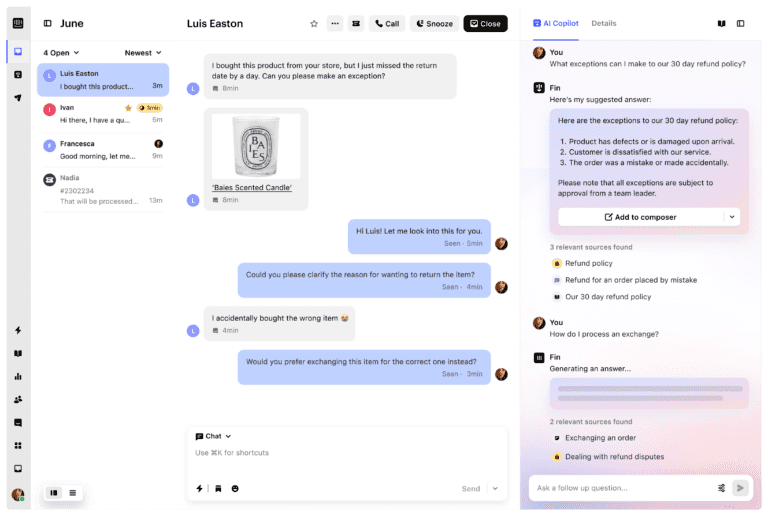 - Fin AI Agent, Intercom’s chatbot, instantly resolves customer challenges and provides fast, accurate answers, decreasing case volume for live agents.
