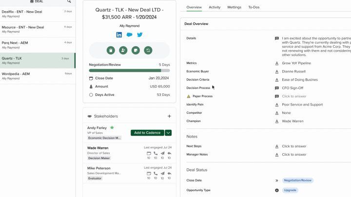 - Detailed reporting helps sellers understand when deals are at risk so they can take corrective action.