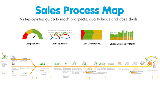 Sales process maps (also known as sales process flowcharts) can vary widely between organizations. Some are simple flowcharts. Others are more complex visual infographics. We’ll take a closer look at some sales process map examples later on.