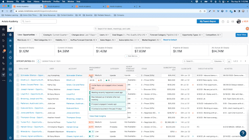 Engagement risk scores make it clear who needs to be followed up with most urgently. And the ability to hone in on things, like meetings that have occurred, emails sent, next steps, customer call themes, and in-deal competitive threats, make it obvious where sales reps need to focus their time to achieve their targets.