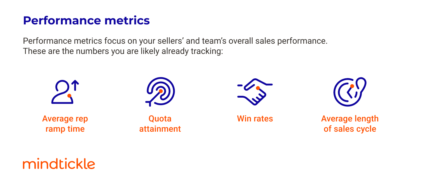 Performance metrics focus on your sellers’ and team’s overall sales performance. These are the numbers you are likely already tracking: