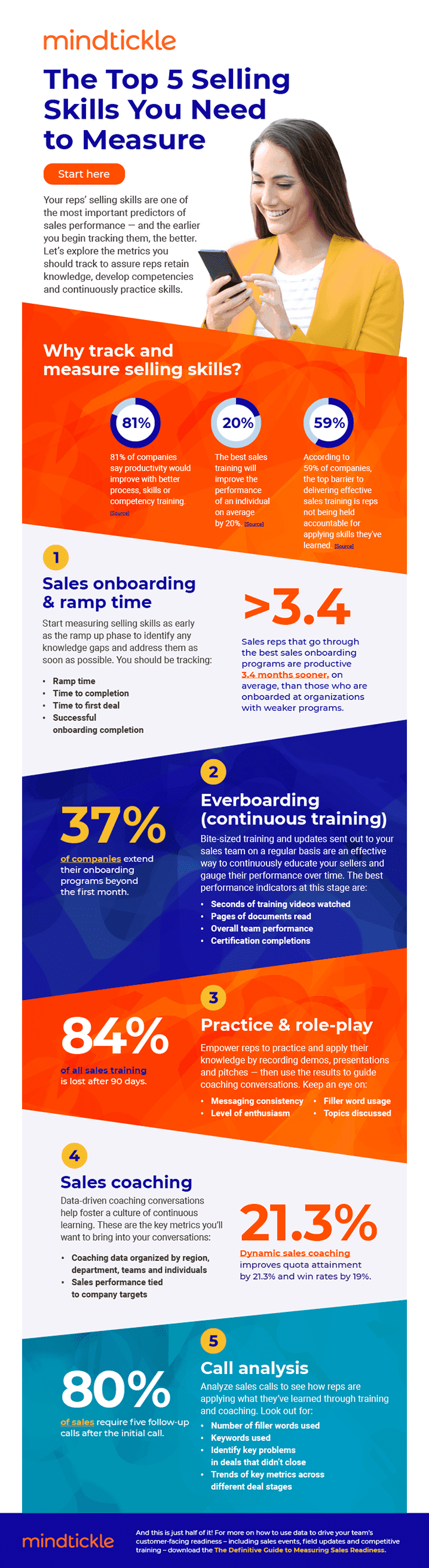 Check out this graphic below that outlines the five buckets of sales training and gives you specific metrics to track in order to truly understand and accurately measure seller performance. Want the full guide? Download the Definitive Guide to Measuring Sales Readiness.